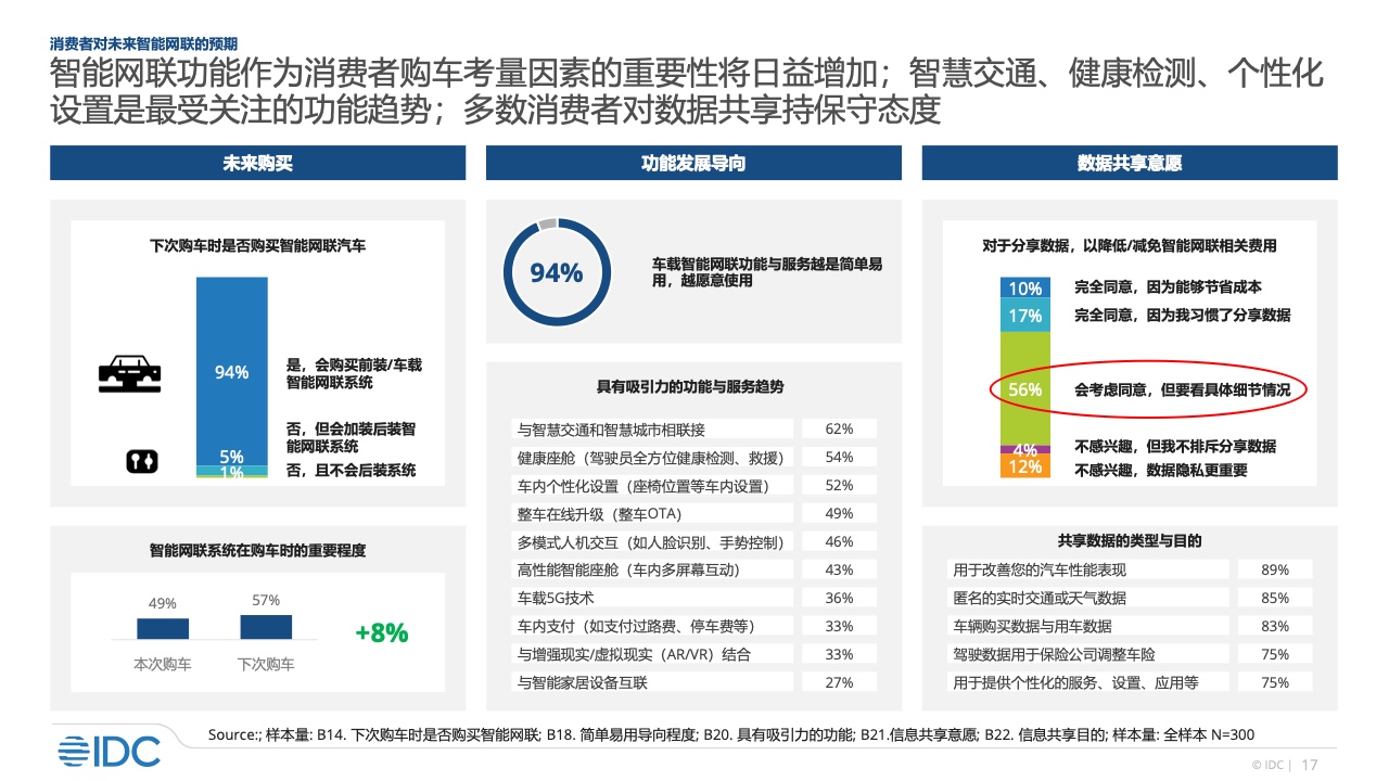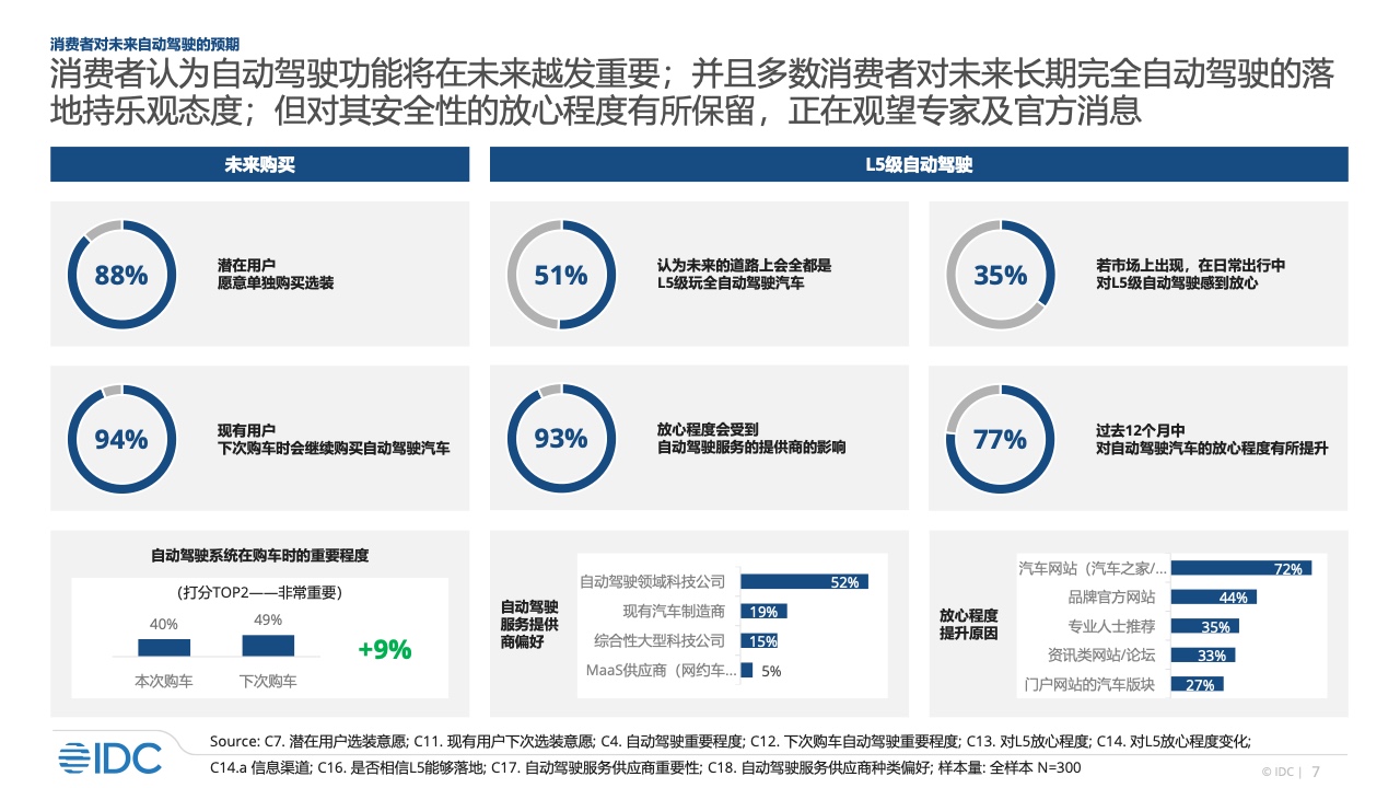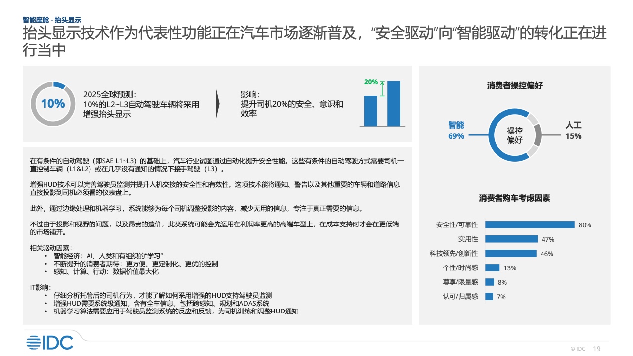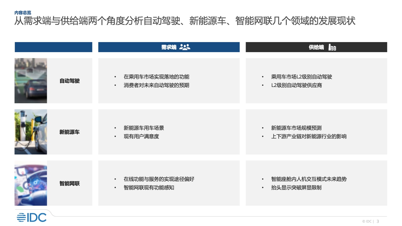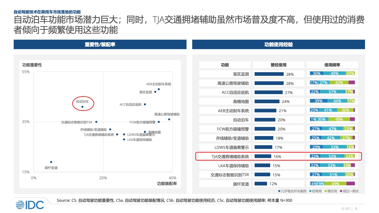 IDC将智能汽车市场定义为∶利用互联网、loT、人工智能、移动通信、云计算等技术,与汽车及交通基础设施相关的公司、产品和服务所组成的生态系统从需求端与供给端两个角度分析自动驾驶、新能源车、智能网联几个领域的发展现状被访者为过去1年内购车的车主或计划未来1年内购车的潜在车主,对智能网联、自动驾驶、新能源车几个概念拥有基本的认知自动泊车功能市场潜力巨大;同时,TA交通拥堵辅助虽然市场普及度不高,但使用过的消费者倾向于频繁使用这些功能消费者认为自动驾驶功能将在未来越发重要。