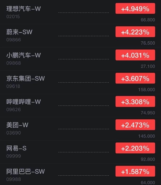 新浪科技讯 11月4日上午消息,香港恒生指数开盘涨0.67%。恒生科技指数涨1.37%。理想汽车涨近5%,蔚来、小鹏汽车涨超4%,京东涨超3%,哔哩哔哩、美团、网易涨超2%。