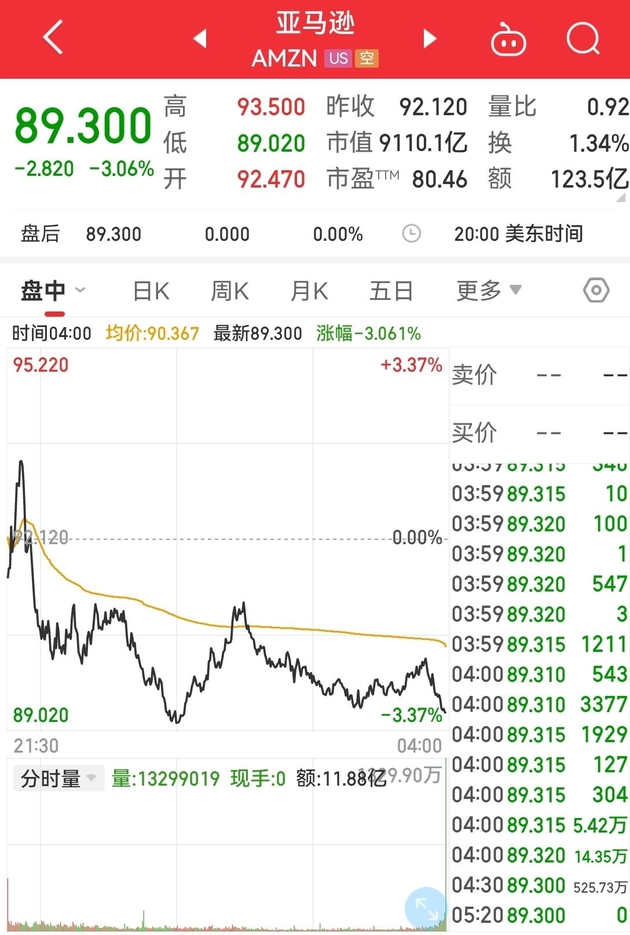 每经编辑 杜宇 据财联社11月4日消息,当地时间周四(11月3日),全球最大的在线零售商亚马逊(AMZN,股价89.3美元,市值 |