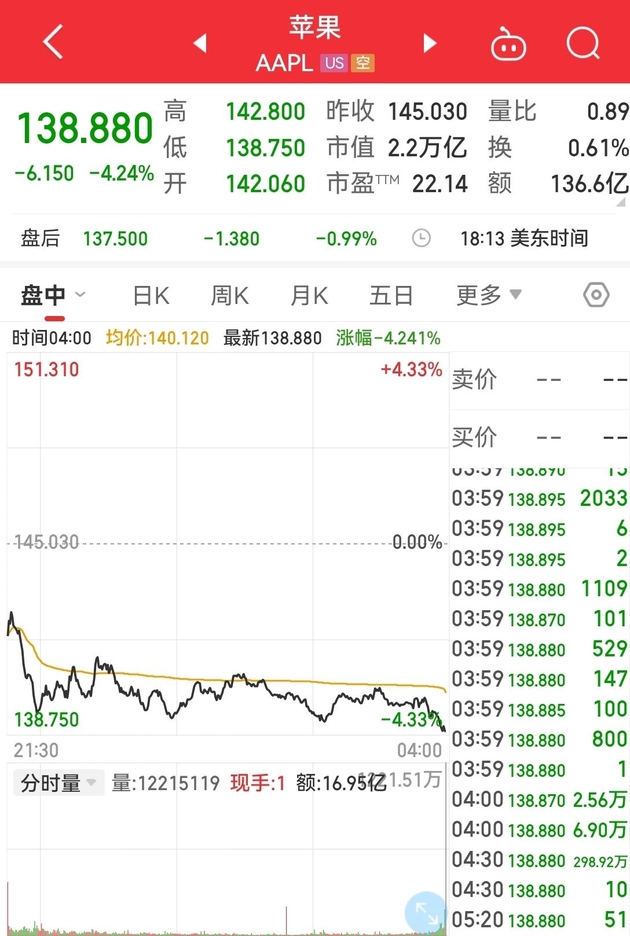 截至3日美股收盘,苹果(AAPL)跌4.24%,报138.88美元/股,最新市值2.2万亿美元,市值一夜蒸发980亿美元(约7156亿元人民币)。