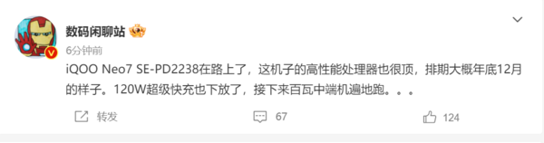 这位博主表示,“iQOO Neo7 SE-PD2238在路上了,这机子的高性能处理器也很顶,排期大概年底12月的样子。120W超级快充也下放了,接下来百瓦中端机遍地跑。。。”