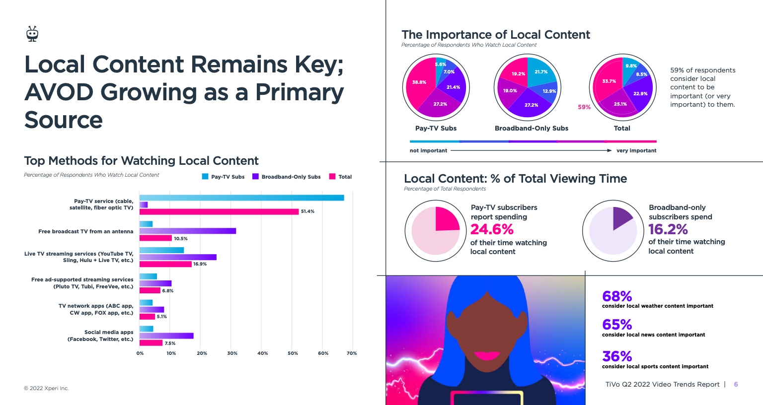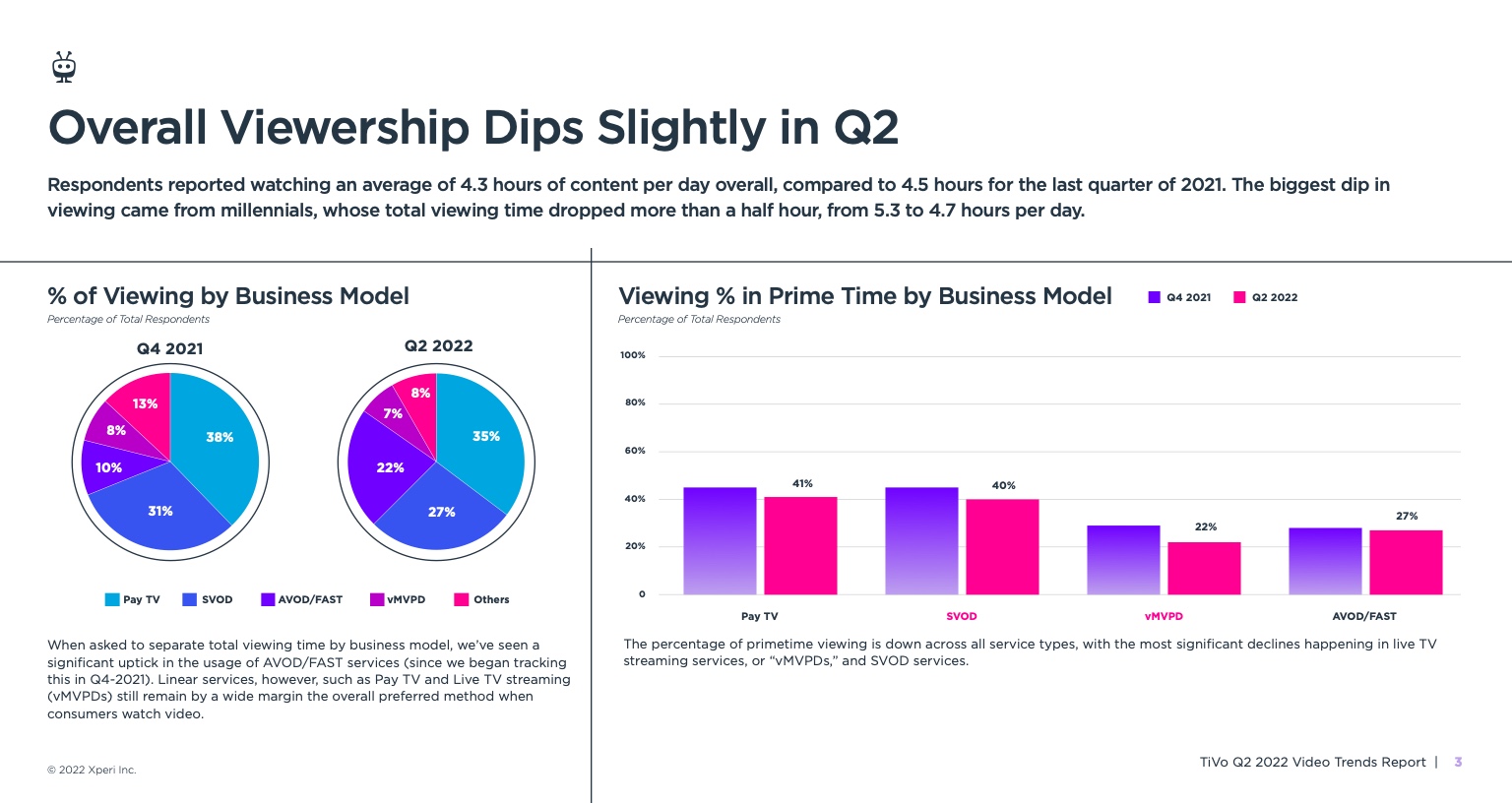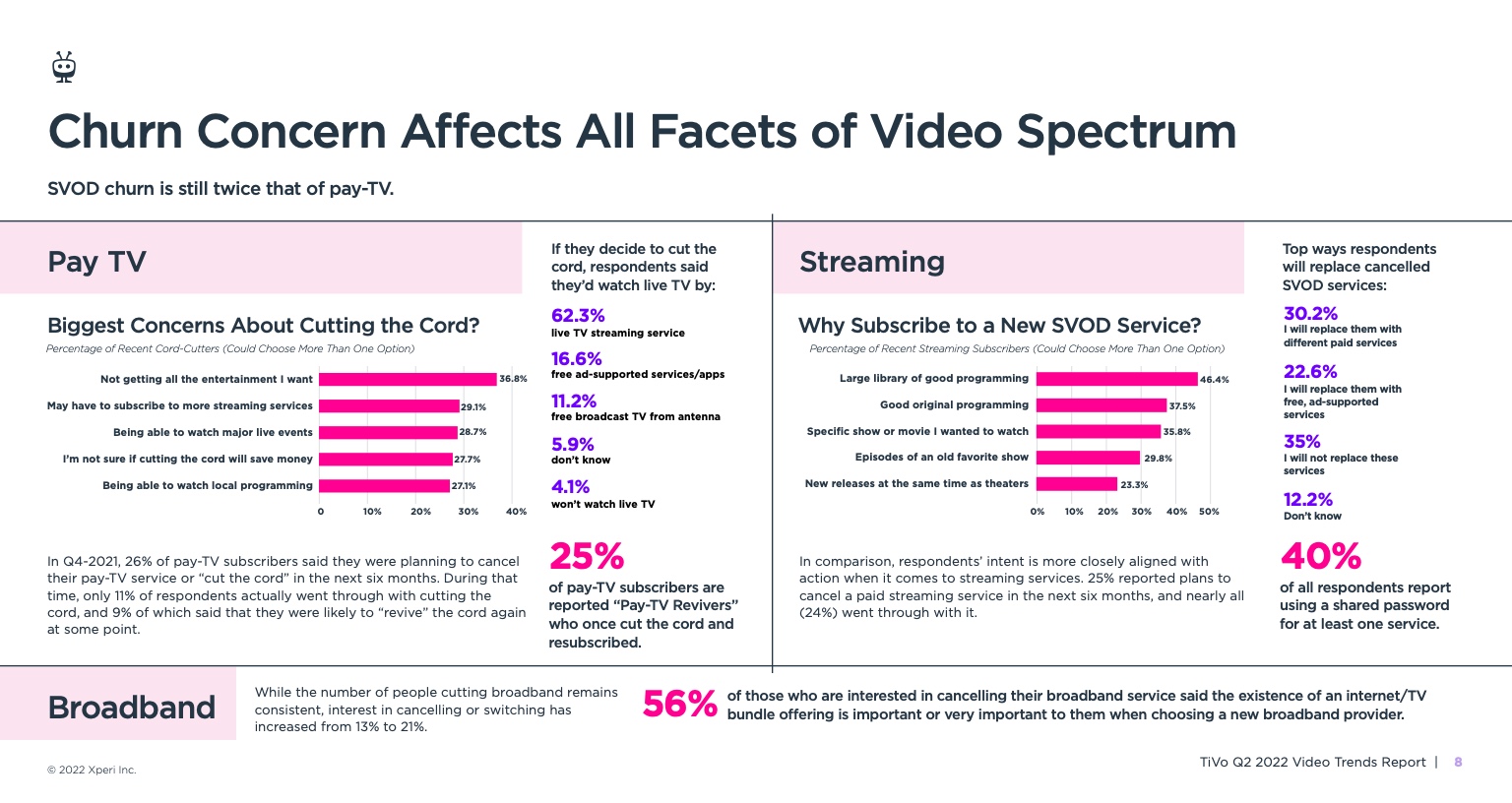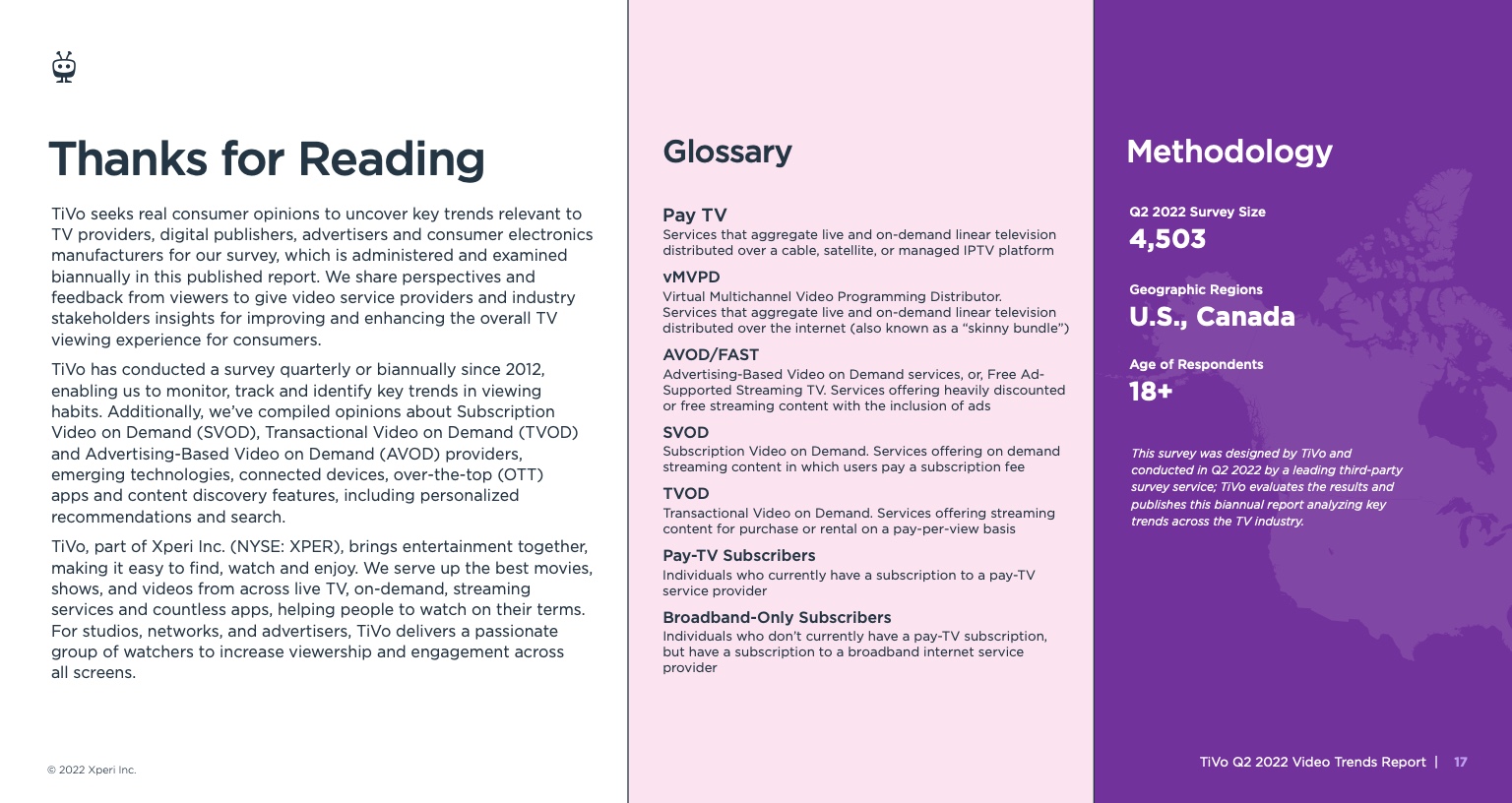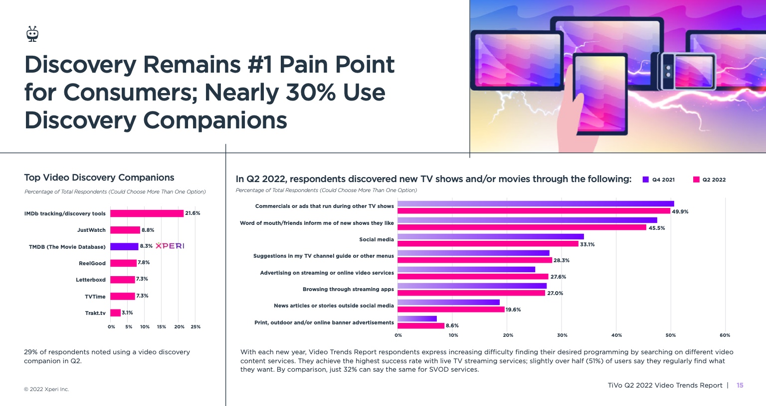 《视频趋势报告:2022年第二季度》,题为《变化越多,不变越多》,调查了美国和加拿大4503名18岁及以上的成年人。它从根本上发现,所有服务类型的黄金时段收视率都有所下降,其中最显著的下降发生在直播电视流媒体服务、vMVPD和订阅视频点播(SVOD)服务。