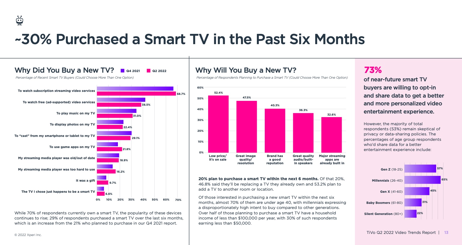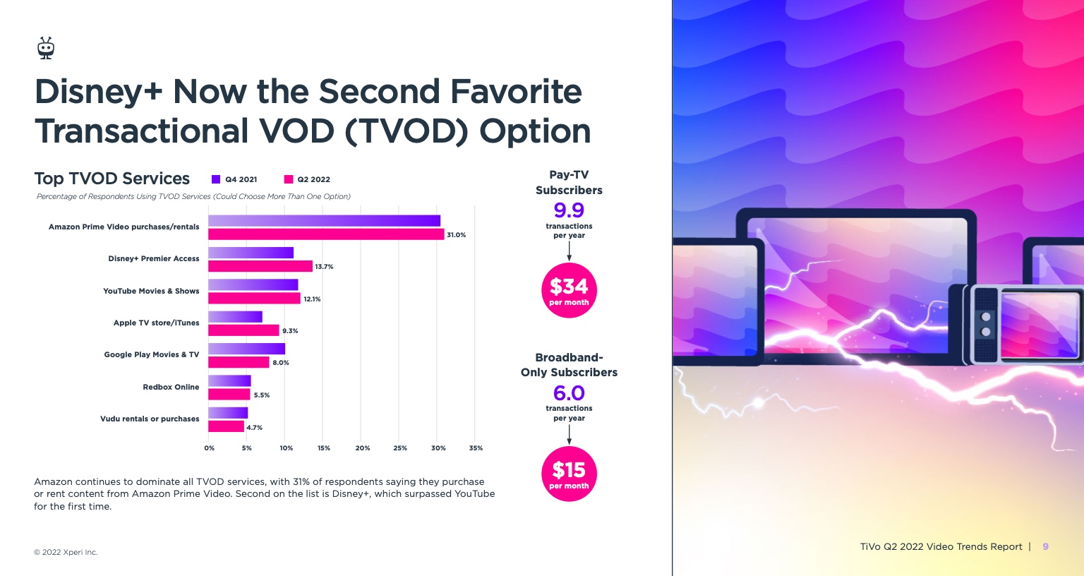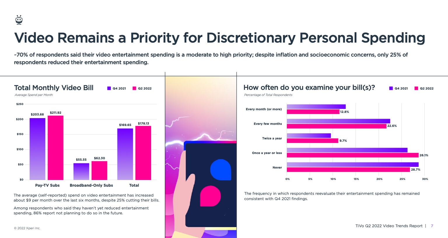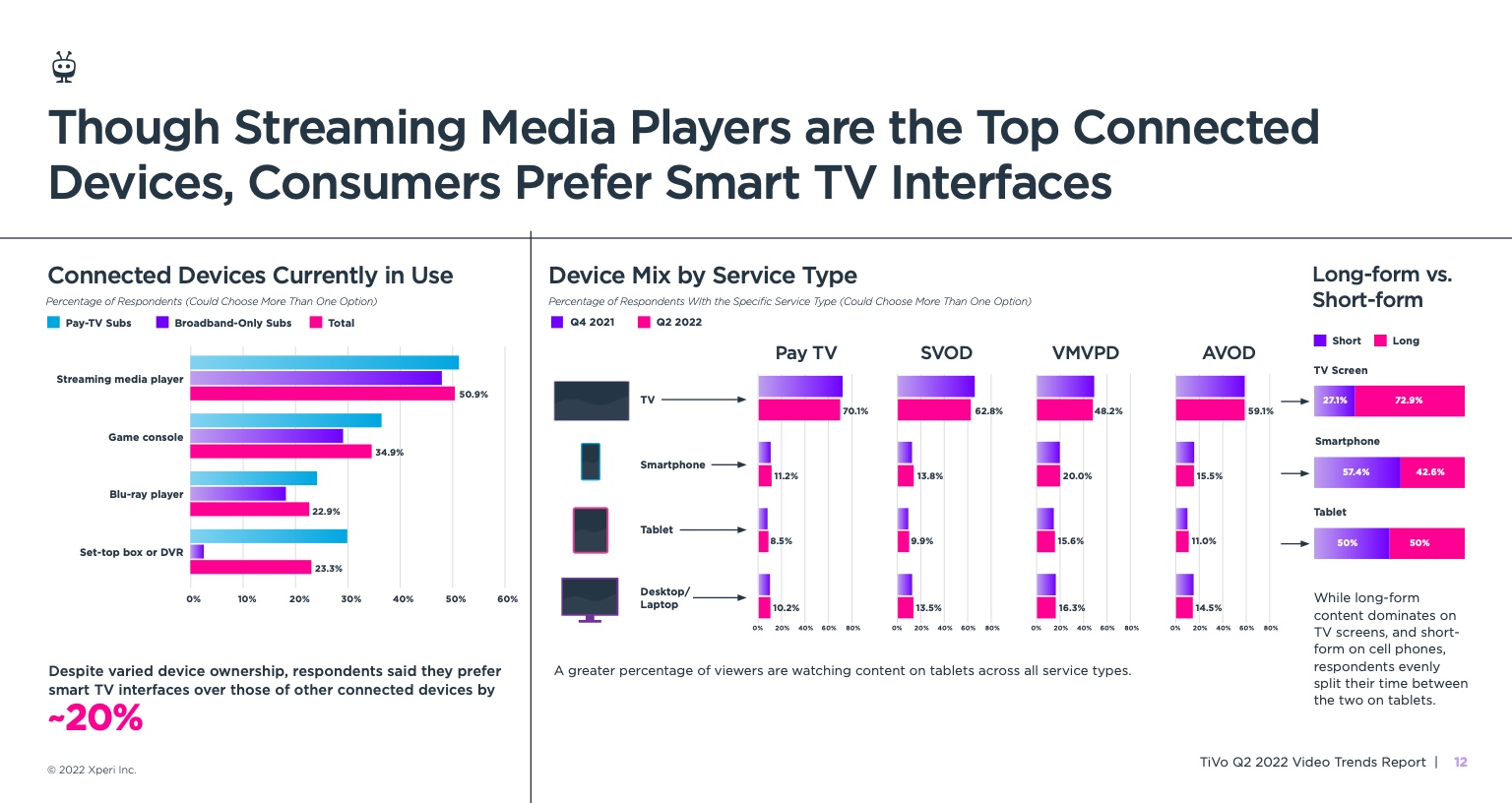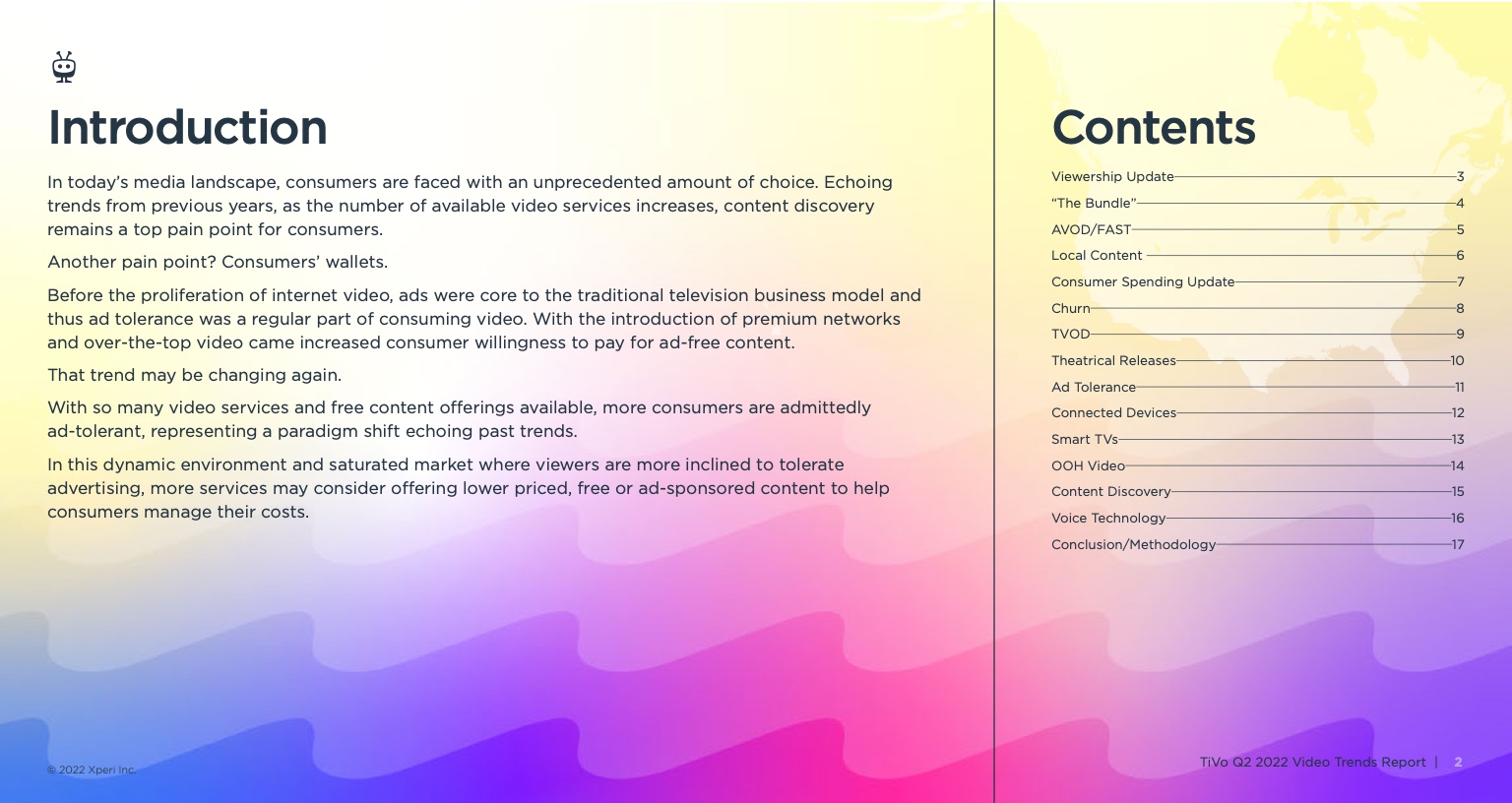 《视频趋势报告:2022年第二季度》,题为《变化越多,不变越多》,调查了美国和加拿大4503名18岁及以上的成年人。它从根本上发现,所有服务类型的黄金时段收视率都有所下降,其中最显著的下降发生在直播电视流媒体服务、vMVPD和订阅视频点播(SVOD)服务。