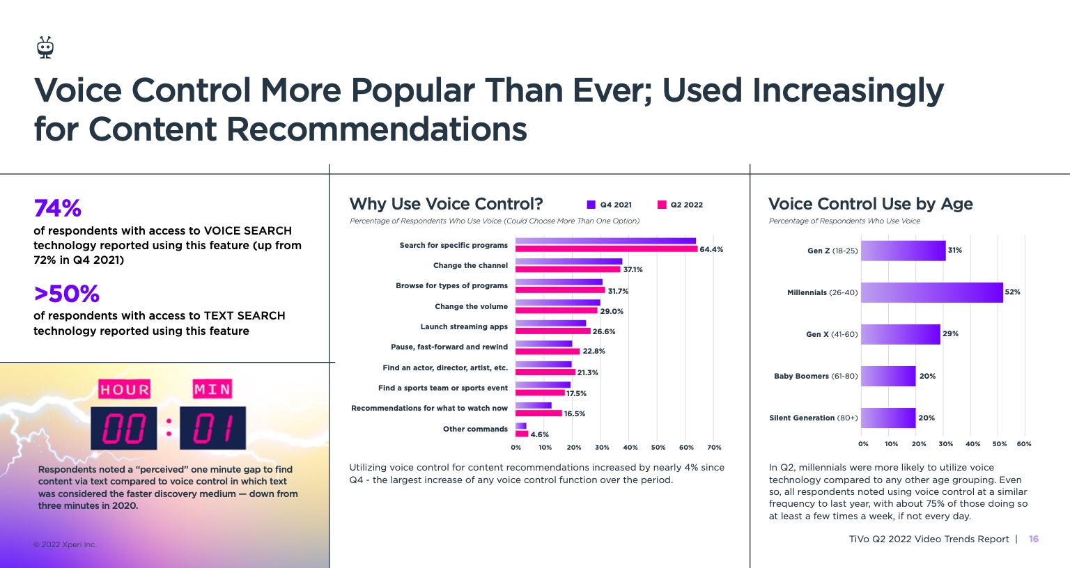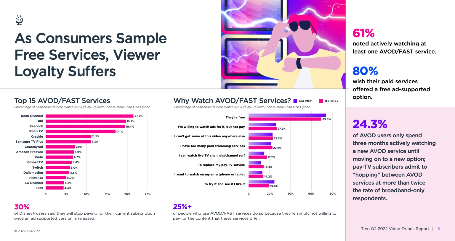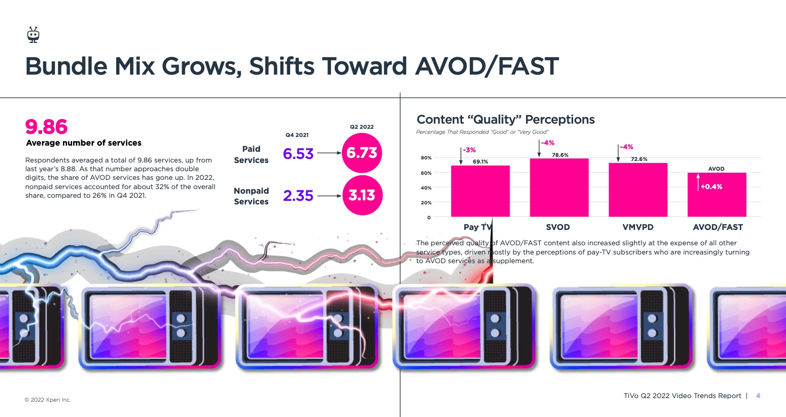 尤其是流媒体,受访者平均使用9.86项服务,高于一年前的8.88项。TiVo强调,随着这一数字接近两位数,AVOD服务的份额有所上升。2022年,非付费服务约占总份额的32%,而2021年第四季度这一比例为26%。AVOD/FAST内容的感知质量也略有提高,但所有其他服务类型的质量都有所下降,这主要是由于付费电视用户越来越多地转向使用AVOD服务作为补充。