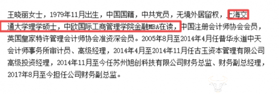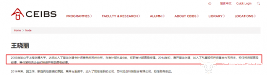 从两则公告中均可以看出,自2005年,王晓丽开始历任普华永道审计员、高级经理。但在CEIBS网站中,她2005年从上海交通大学毕业之后加入的是普华永道的苏州分所。