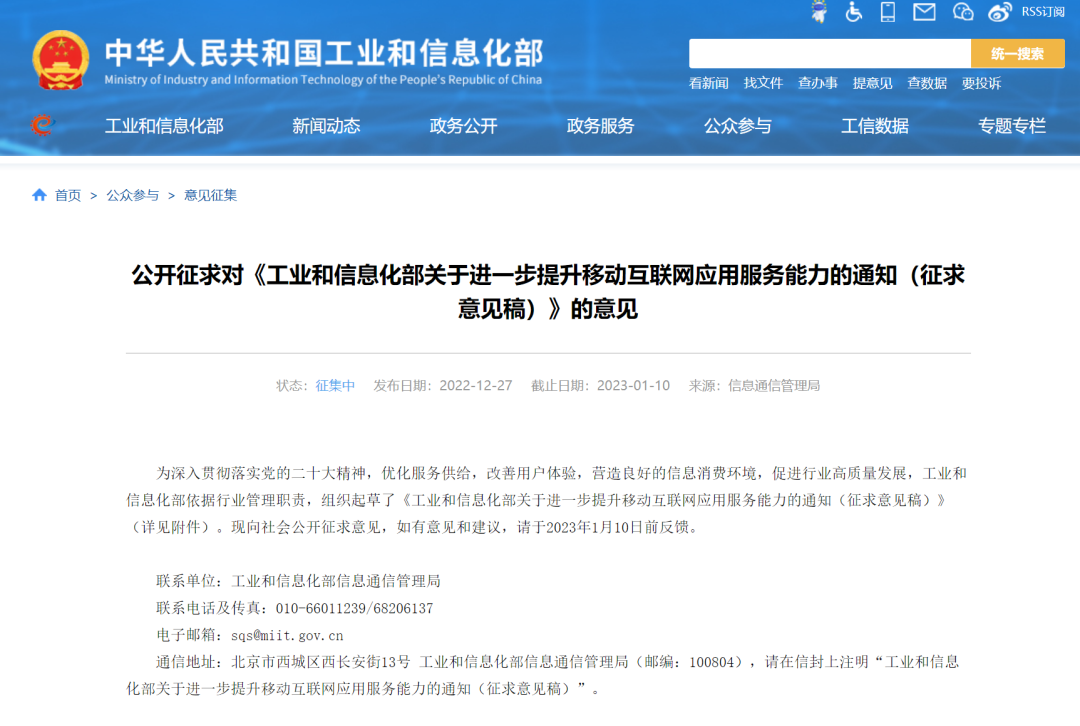 C 114讯 12月28日消息(乐思)近日,工信公开征求对《工业和信息化部关于进一步提升移动互联网应用服务能力的通知(征求 |