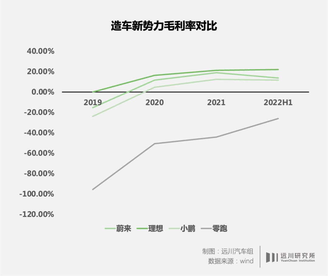 激进的以价换量帮助零跑在去年交付量突破11万辆,与蔚小理在伯仲之间。但代价则是,蔚小理在2020年实现毛利转正,转年接近了15%的行业平均水平,而零跑的毛利率到去年第三季度仍然是-8.9%[2]。