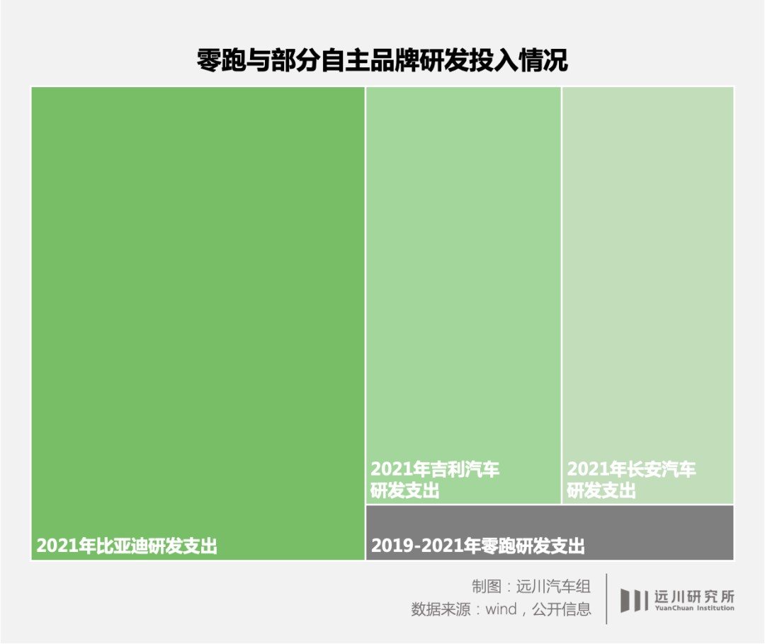 从研发投入来看,2019-2021年三年,零跑累计研发支出约为14亿元,而长安仅在2021年的研发投入就是其3倍,吉利是4倍,比亚迪大约是其7.5倍。