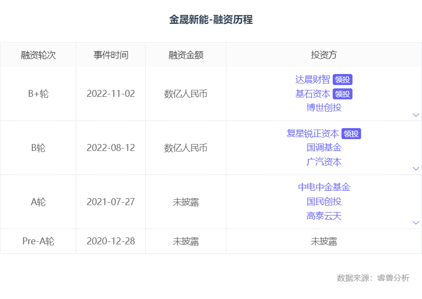 近日,金晟新能源完成数亿元B+轮融资,本轮融资由达晨资本和基石资本联合领投,博世、陕汽、国调战新、广东省产业发展基金、中小企业国中基金、博时基金等知名机构跟投。