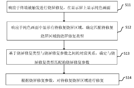 根据天眼查APP上的专利摘要显示,烧屏修复方法包括:响应于终端被触发进行烧屏修复,在显示屏上显示纯色画面,从而显示有待修复烧屏区域,确定匹配的烧屏修复类型;基于修复类型与修复参数之间的对应关系,确定匹配的烧屏修复参数;根据烧屏修复参数,对待修复烧屏区域进行修复。本公开可以实现快速检测当用户长时间使用终端上任一应用程序时在该应用显示画面上发生的烧屏现象。