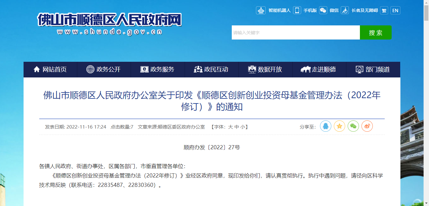 顺德区创新创业投资母基金管理办法(2022年修订)