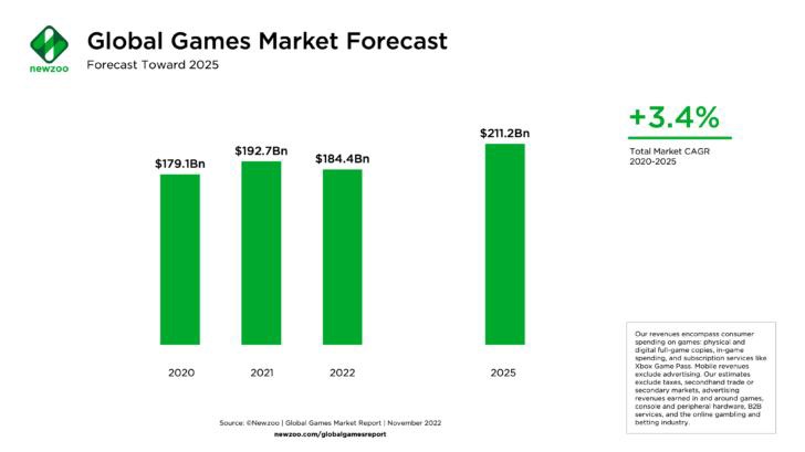 原标题:Newzoo:预计2022年全球游戏市场总营收1844亿美元 同比降幅为4.3%,本文由199IT发布,现在由科技之家小编2022年11月23日转载分享。