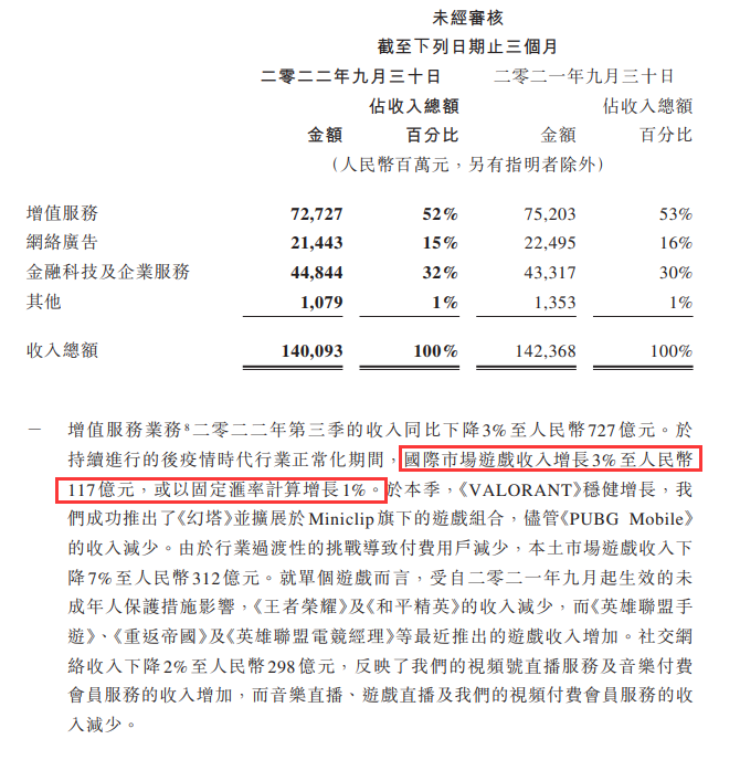 原标题:腾讯:2022年Q3腾讯国际市场游戏收入达到117亿元 增幅3%,本文由199IT发布,现在由科技之家小编2022年11月23日转载分享。