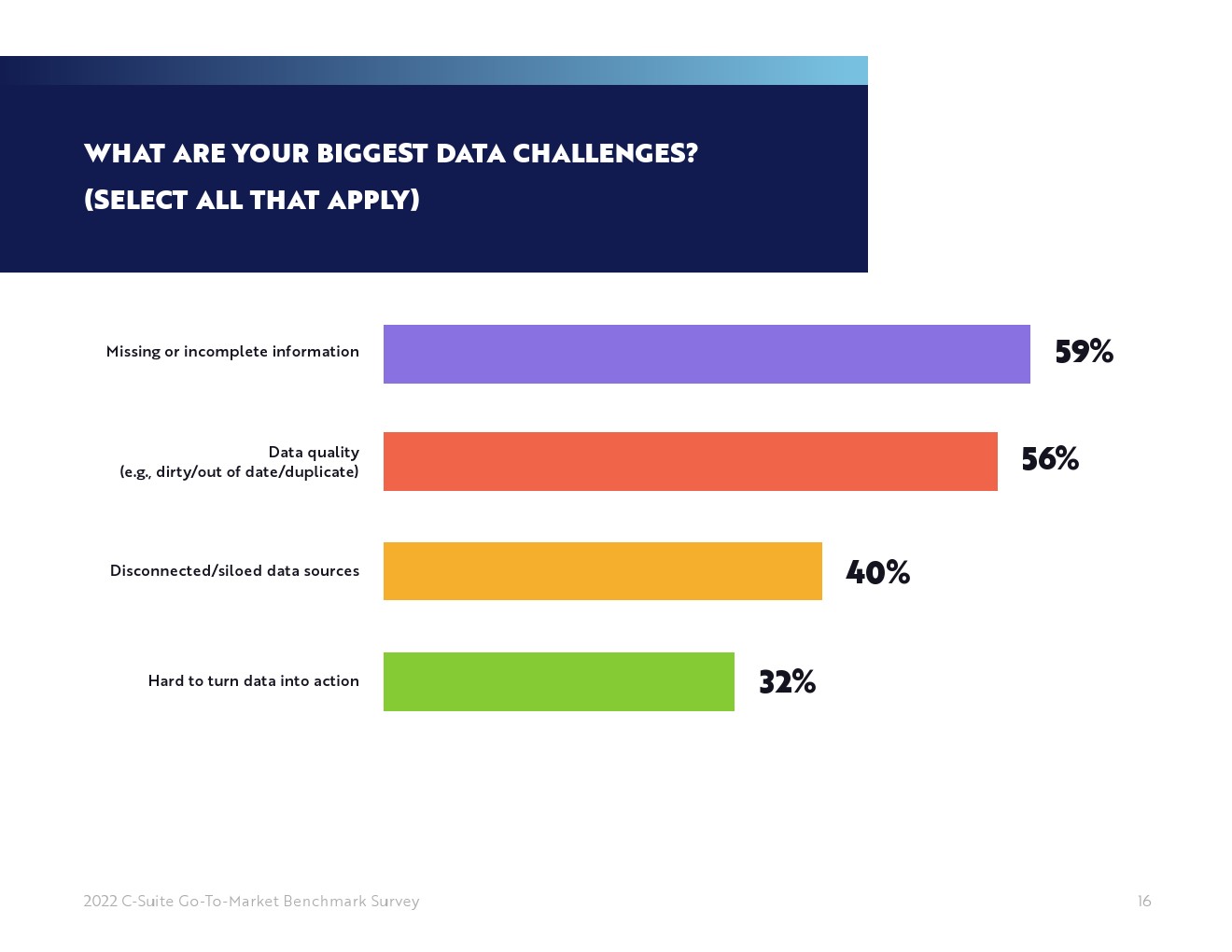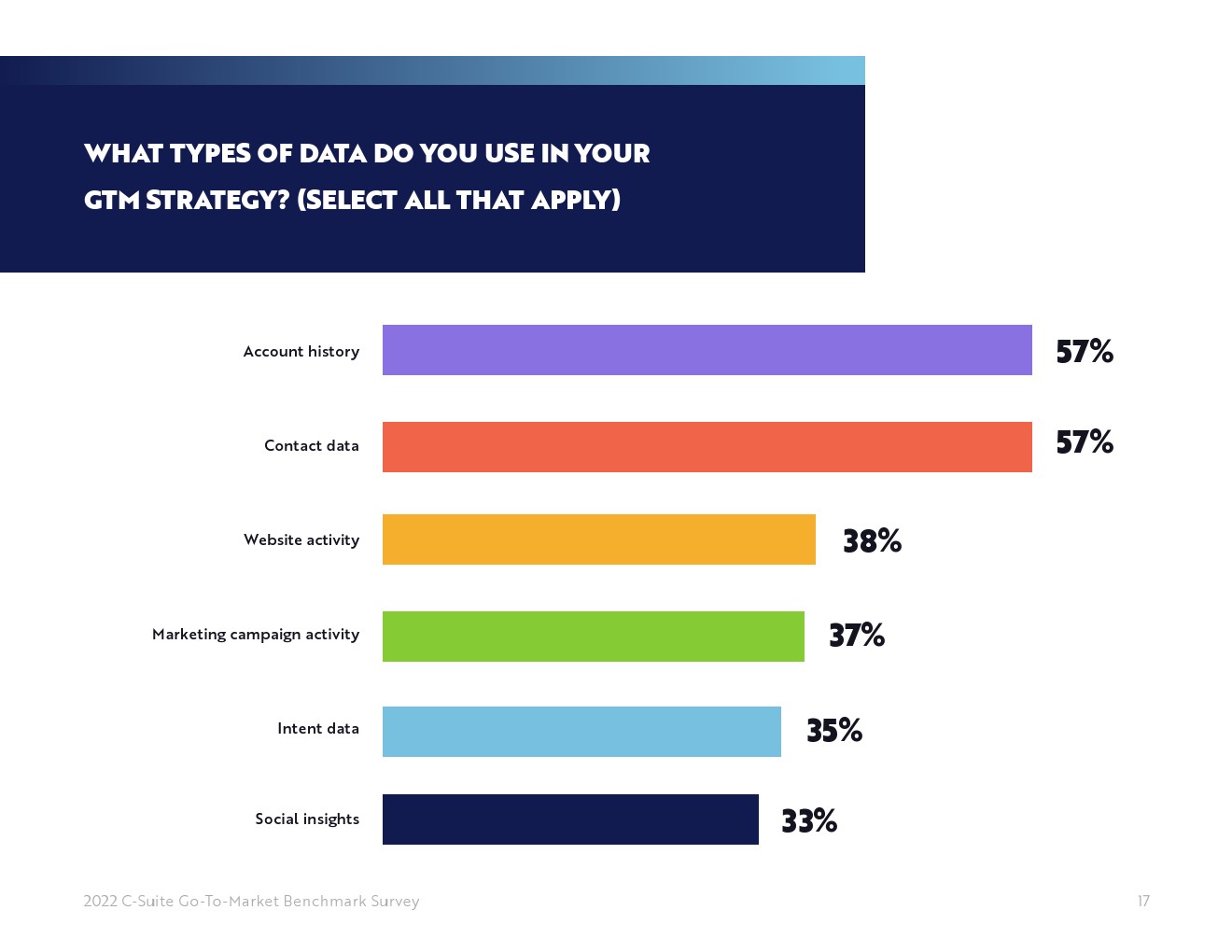 当被问及企业如何在其GTM战略中使用客户情报(包括意图数据和技术图表)时,59%的企业将其用于客户优先级排序,55%的企业依赖于客户情报进行竞争,49%的企业使用客户情报进行个性化消息传递和外联,39%的企业利用客户情报来提供选择,26%的企业转向客户情报来确定其参与时间。
