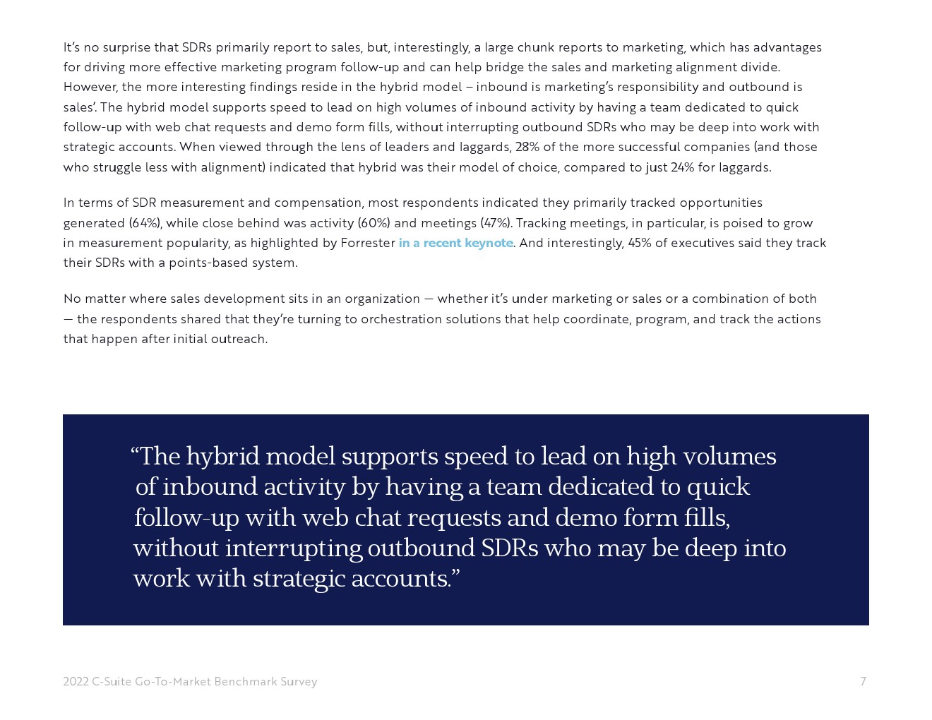 虽然41%的SDR(销售开发代表)向销售报告,22%向营销报告,但26%的SDR实际上采用了一种混合模式,即销售处理输出工作,营销处理输入工作。