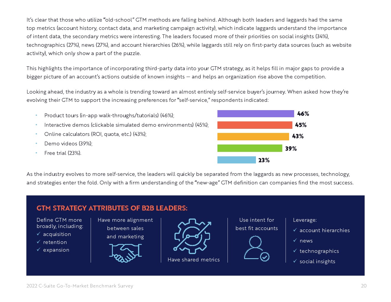 整个行业正趋向于支持自助式旅程,受访者表示他们正在发展GTM。这样的努力——如产品巡演(应用内演练/教程46%)、交互式演示(45%)、ROI、配额等在线计算器(43%)和演示视频(39%)——现在很重要,将来也会更重要。