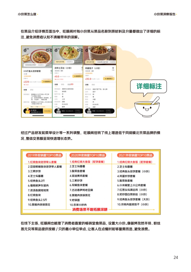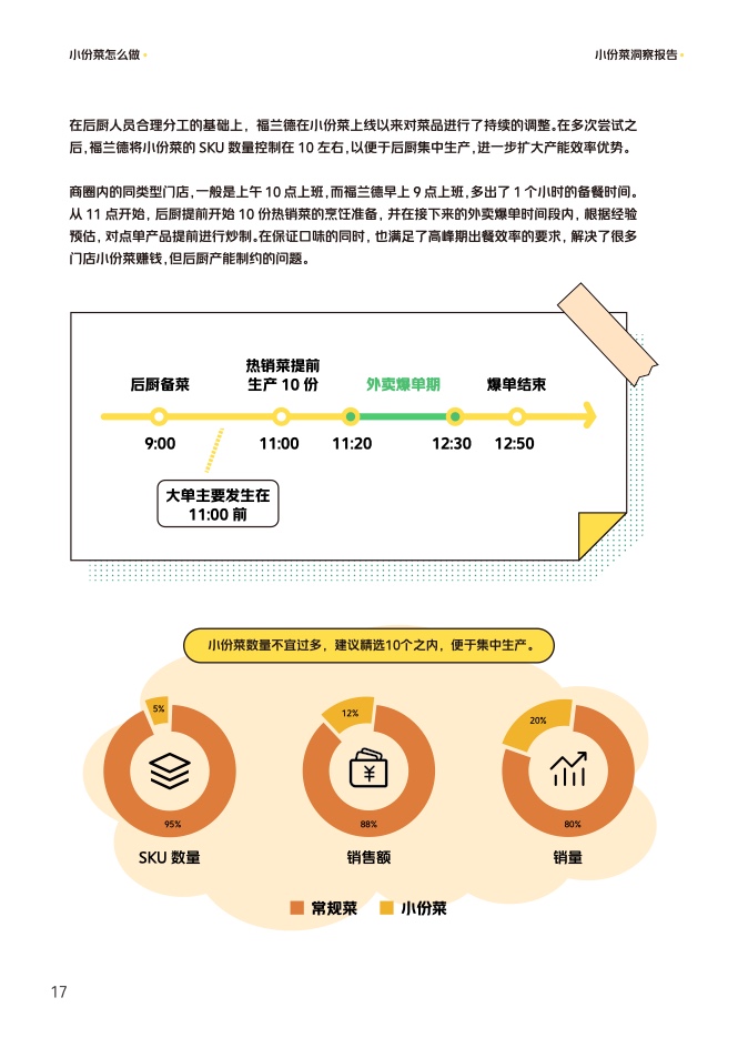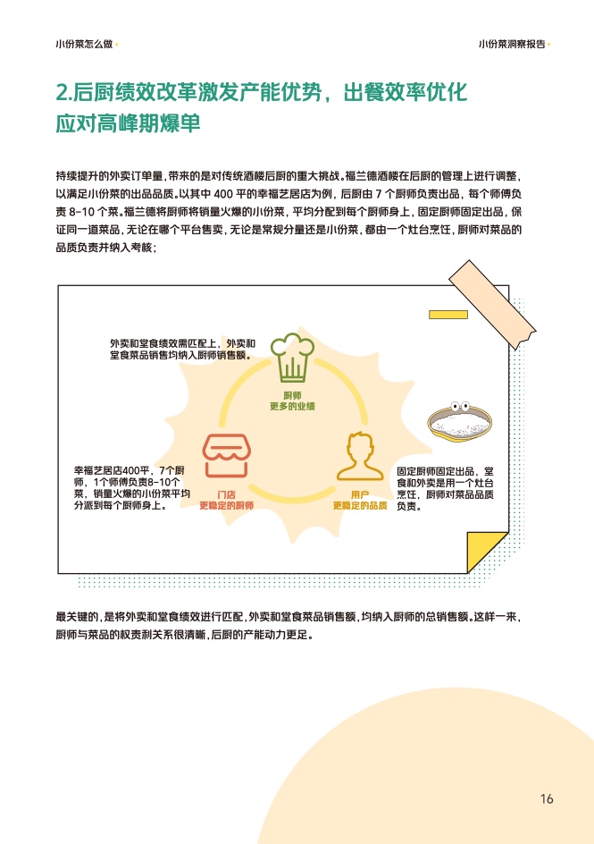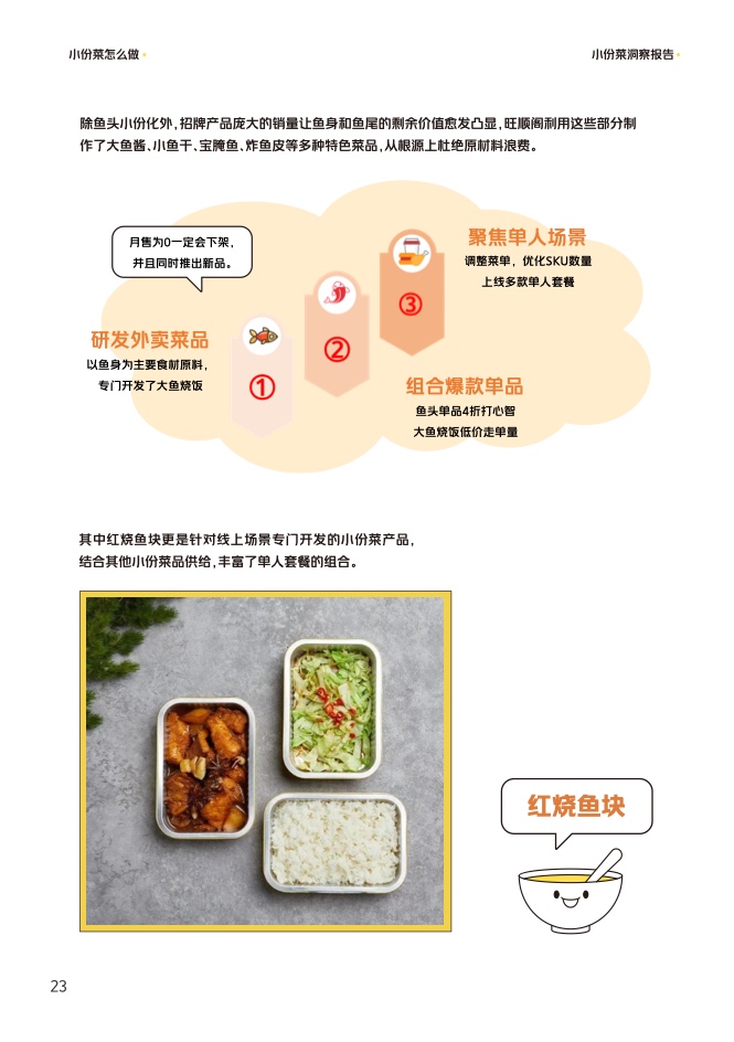 南京大牌档在美团业务经理的建议下,为小份菜在外卖平台上单独列出一个专栏,并进行了更多小份菜品的开发,满足更多消费场景,减少浪费的同时还进一步拉动了销量。云海肴外卖总监杜祥宏表示,云海肴上线的小份菜并非简单地按照普通餐品的规格减半,而是制定了新的小份菜标准卡。目前,云海肴全国门店平均月大概可以售出16万份小份菜,未来计划进一步优化小份菜系列菜单,让顾客享受更多实惠。