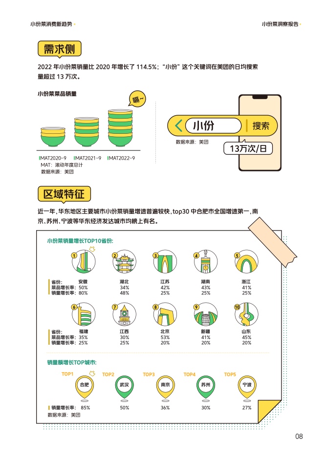 随着外卖消费者适量点餐、多样化点餐需求的增长,外卖“小份菜”与“小份饭”应运而生。据《报告》显示,美团提供小份菜的商户数与相关菜品数量比2020年增长了接近一倍,小份菜销量同比2020年增长了114.5%。2022年,“小份”这个关键词在美团的日均搜索量超过13万次。