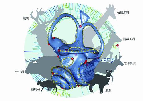 此外,内耳迷路形态还表明,长颈鹿超科、叉角羚科与基干有角类的内耳迷路形态更加接近,支持前两者为各冠群中最先分化出来的类群,这与分子系统发育给出的结果一致。