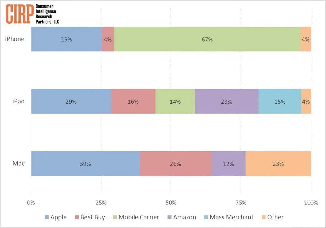报告主要研究了美国苹果消费者是从什么渠道购买苹果产品的。报道中指出在 iPhone 上,67% 的美国苹果用户都是通过运营商渠道购买的;25% 的美国苹果用户是通过 Apple Store 零售渠道购买的。