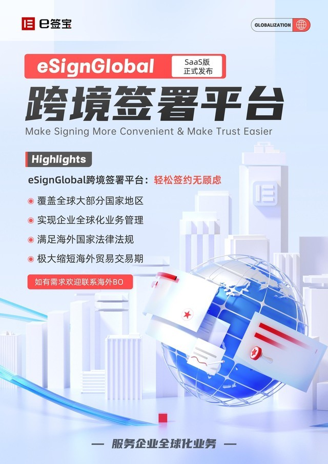 凭借电子签名领域的服务经验,e签宝推出eSign Global跨境签署平台,在确保数据安全、合同合法有效的前提下,大幅提升跨境签署及合同管理效率,助力外贸企业降本增效,轻松解决全球化签约难题。
