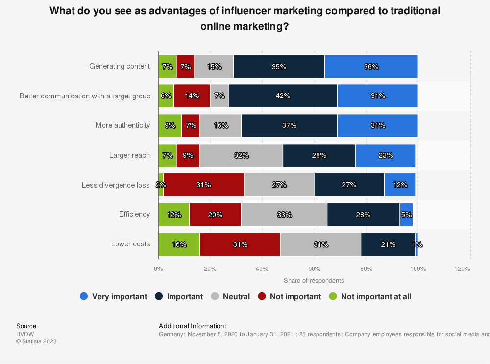 如今,似乎任何人都能数出许多流行的社交媒体平台,但全球最主要的网红营销平台是Instagram。Instagram有几个特点,直接影响了影响者营销的性质。网红可以发布自己的视频和照片;该应用还提供评论和消息功能。后者为关注者和商业参与提供了机会。与传统的网络营销相比,德国企业看到了网红营销的几个优势。根据2020年进行的一项调查,36%的人认为生成内容非常重要,31%的人认为网红表现出更多的真实性。同年,22%的德国公司计划在网红营销上投入1万至5万欧元。