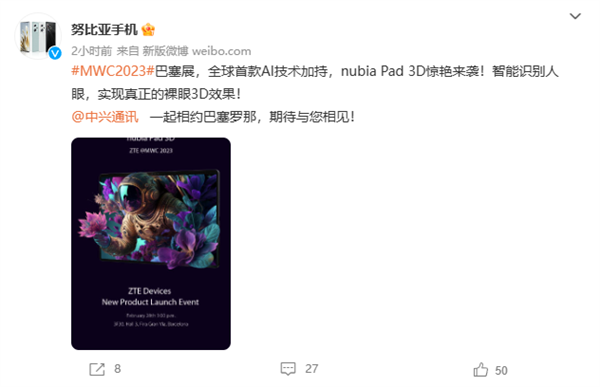 2月16日消息,努比亚宣布,将参加在法国巴塞罗那举行的MWC 2023展会,带来旗下首款平板nubia Pad 3D。