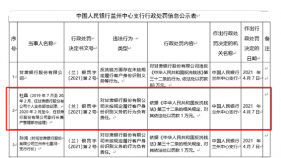 值得一提的是,2021年4月,因反洗钱违规,甘肃银行曾收到央行兰州中心支行开出的数张罚单,被罚款88万元。同时,已由甘肃银行个人业务部总经理升任副行长的杜晶,因对未按规定履行客户身份识别义务的行为负有责任,被处以罚款1万元。