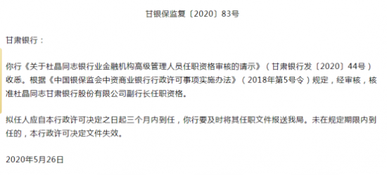 2019年12月,杜晶迎来了他银行事业生涯的又一黄金时刻,成为甘肃银行副行长。次年5月26日,经中国银保监会核准杜晶甘肃银行副行长任职资格。