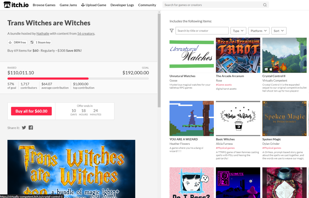 截至目前,该游戏捆绑包已经为创作者们筹集了超过130,000美元,距离原定目标192,000美元相差不远。而“跨性别巫师也是巫师”活动要到24日才正式结束,一些独立游戏创作者也有机会从中获取宣传和收益。