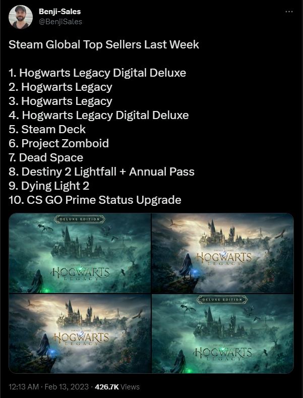 然而即便如此,《霍格沃茨之遗》的销量和热度依旧势不可挡。除了发售首周末在线玩家高达80万外,本周Steam游戏的畅销排名上,《霍格沃茨之遗》直接以四个版本占据了销量榜前四,将Steam Deck挤到了第五。